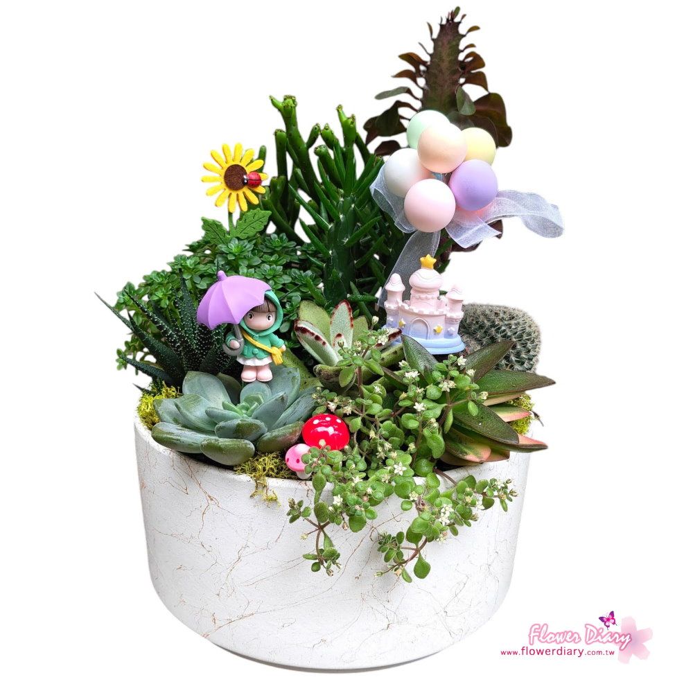 花材:多肉植物(種類隨機) 城堡氣球屋(顏色隨機) 人造飾品(樣式隨機)